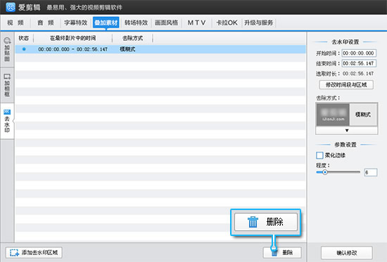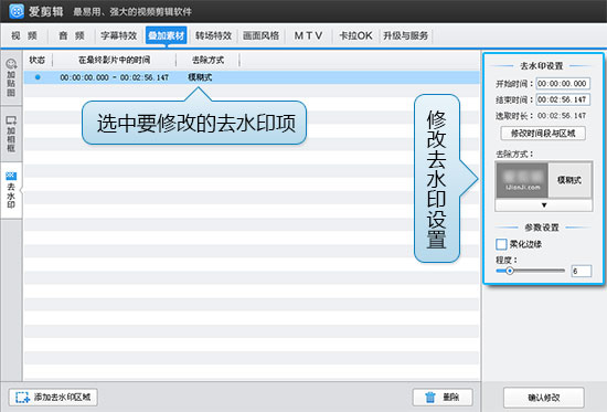 在“叠加素材”面板点击“去水印”栏目,在去水印效果列表中,选中需要修改的去水印效果,即可在其右侧“去水印设置”栏目,对去水印效果进行修改。设置完毕后,点击“确认修改”按钮即可。