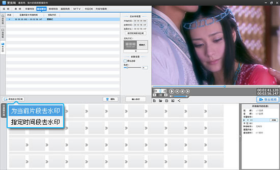在去水印列表和视频预览框中间的“去水印设置”区域,可对去水印时间段、去除方式等进行详细设置。由于爱剪辑所提供的去水印方式非常齐全,根据视频画面选择最合适的“去除方式”,我们可以做到去水印后的视频几乎看不出去水印痕迹。譬如,如果原视频画面需要去除水印的部位,大面积为同一颜色,那在“去除方式”处选择“腐蚀式”即可实现无痕去水印。