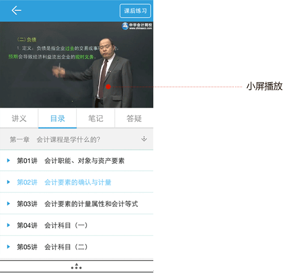 首先,在我的课程列表中选择班次之后,可以进入课程内容,首先进入的是小屏播放