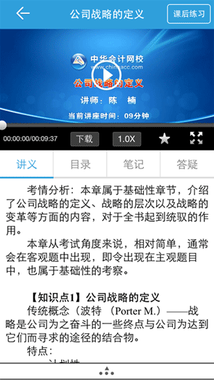 三、在视频播放页面,针对该课程可以查看目录、练习、提问、下载操作。