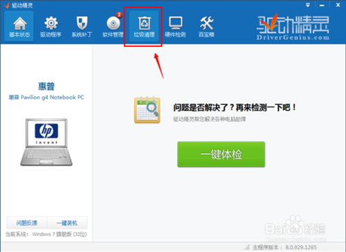 打开驱动精灵软件2015,找到菜单栏中的“垃圾清理”工具,也可以点击 一键体检检查清理垃圾