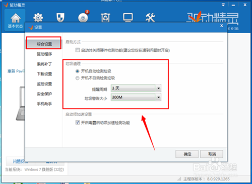 点击驱动精灵设置选项卡,找到 综合设置功能--其中垃圾清理,默认是3天自动扫描清理一次。可以只能自定义设置