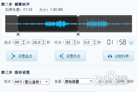 之后我们就要开始着手进行铃声的剪辑了,因为这只是附属的铃声编辑器而已所以其实剪辑也是很简单的,只要设置好起始点和终点的位置就可以了