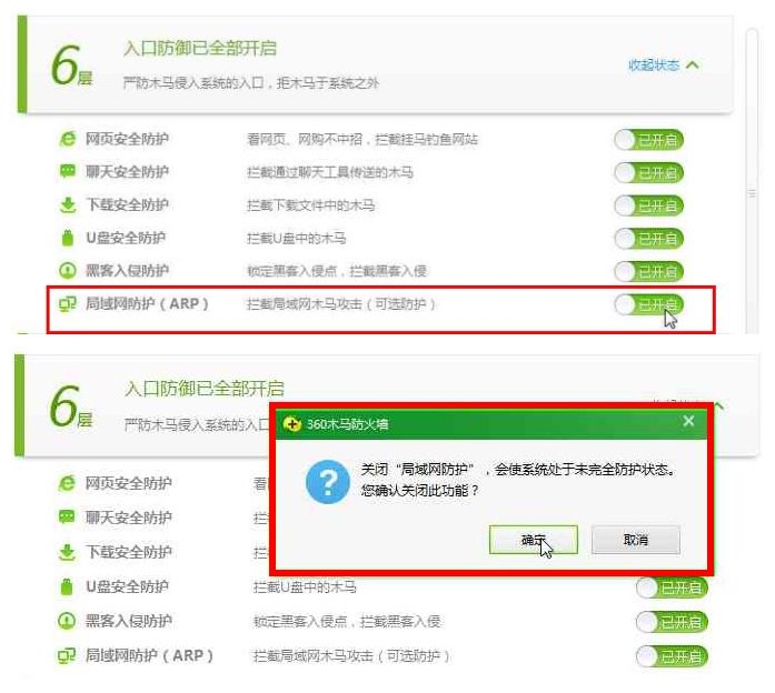 在查看状态的下拉信息里找到局域网防护(ARP),将其已开启状态拖至未开启,并点击确认。