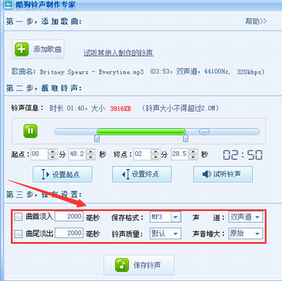 2、进入铃声制作页面,就可以发挥你的所长了,跟很多的音乐编辑工具差不多。最重要的设置开始和结束时间,可以鼠标点击,也可以设定时间。同时还有其他很多设置,我就不一一介绍,你可以去自己尝试就可以了。同时,还可以试听。如图。