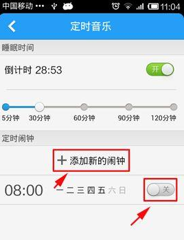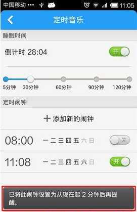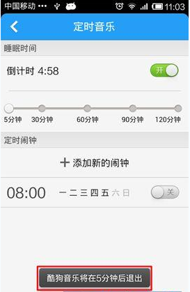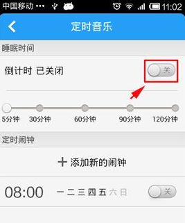 2、点击“定时音乐”进入界面。在睡眠时间倒计时点击开启按钮,刚开启时是设定为5分钟后退出,你可以根据实际情况设定播放器将在多少分钟后自动关闭;(如下图所示)