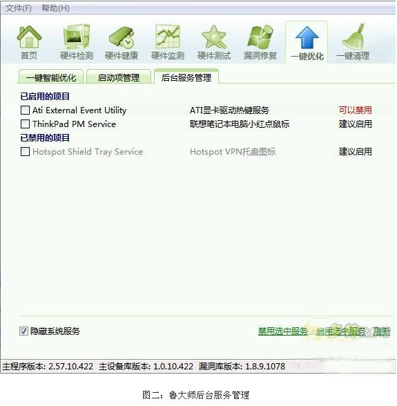 运行鲁大师,进入开始界面,然后点击一键优化,进入优化界面。点击“启动管理器”中的引导管理器界面,如图二可以清楚地看到计算机“的启动程序与未启动程序”