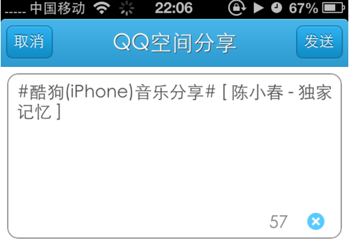 之后点击空白处,就会弹出分享层,点击分享按钮,会弹出菜单,让你选择分享到哪里,目前旧版的酷狗音乐支持分享到 QQ QQ空间 微信 新浪微博 和朋友圈,但新版的好像屏蔽了分享的朋友圈的权限