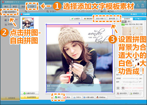 6、最后还可以点击“文字” “文字模板”添加合适的文字素材。并使用“拼图” “自由拼图”给照片添加白色拼图背景边框。