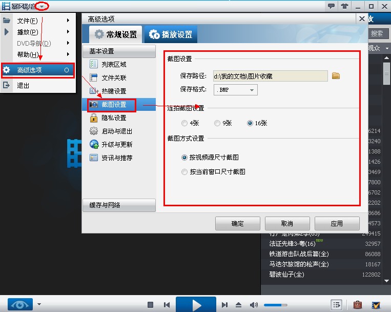 默认截图路径及连拍张数等相关路径在主菜单-高级选项中设置;