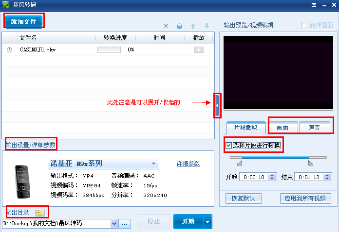 暴风工具箱中的“暴风转码”中实现;将文件添加后,按照操作提示一步一步设置即可,视频截取目前必须通过转码来实现;(如图)