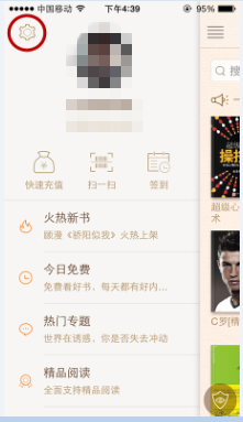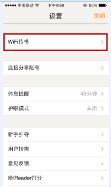 然后你就会看到“WiFi传书”的字样,如下图所示,开启它你就可以在掌阅iReader上开启wifi传书了。