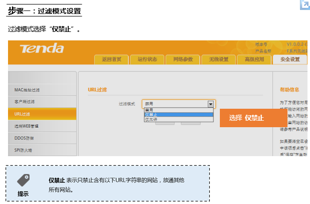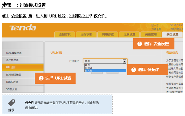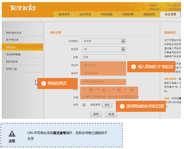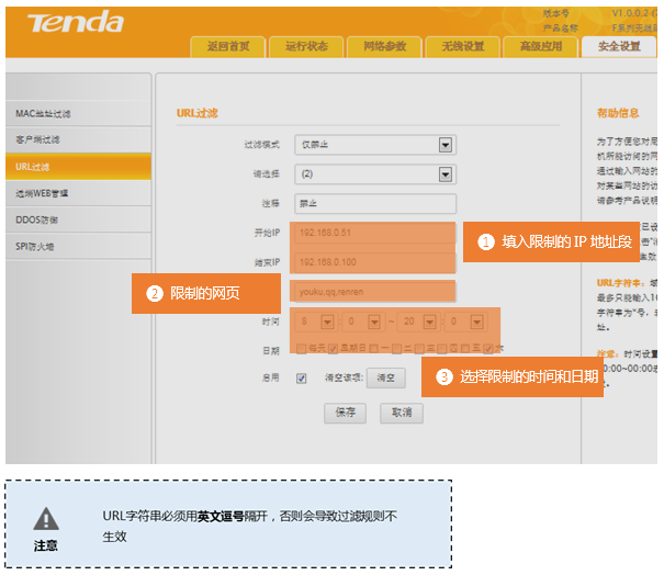 在登录到路由器管理界面后,在安全设置 的 URL过滤 界面中来实现限制一的条件: