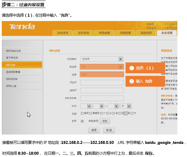 IP地址为192.168.0.2 — 192.168.0.50,在 周一至周五 8:30 –— 18:00,只允许访问baidu,google,tenda。