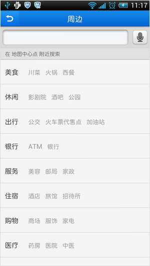 在主界面顶栏点击周边搜索,进入周边搜索界面,您可直接点击周边搜索的关键词进行周边搜索,也可在顶部输入框手动输入关键词进行周边搜索。