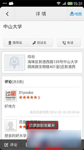 1、因为很多朋友都不知道如何收藏地点,下面先简单的向大家介绍下如何收藏地点。首先打开手机百度地图,找到你要收藏的地点,长按它,出现个如下图的图标后,点击进入详情,再点击收藏,出现已添加到收藏夹即已成功收藏该地点