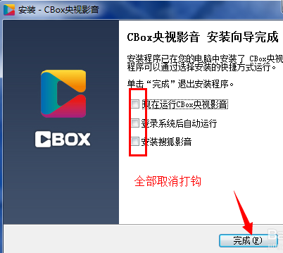 3、安装完后点掉如图所示复选框中的小勾(否则将会开机启动,并且安装捆绑软件)。点击”完成“。