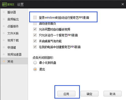 4、进入其他页面后,取消勾选“登入windows时自动运行爱奇艺pps影音”如下图所示: