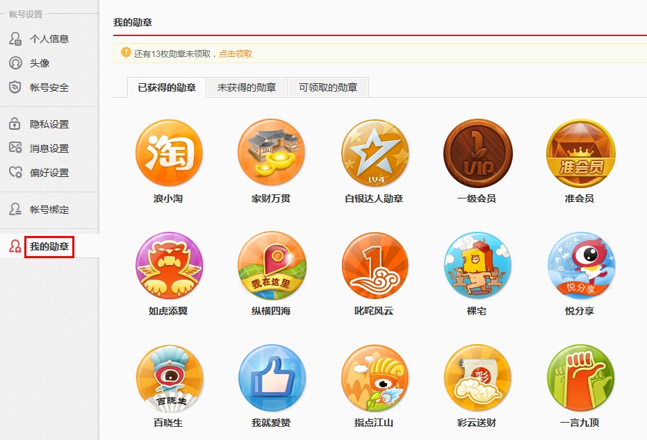 勋章会在您的个人微博页右侧展示,或者进入帐号设置-我的勋章中查看,还可以进入勋章馆查看您的勋章。