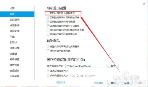 在右边的选项里,我们把“开机时自动启动酷我音乐”的勾给去掉