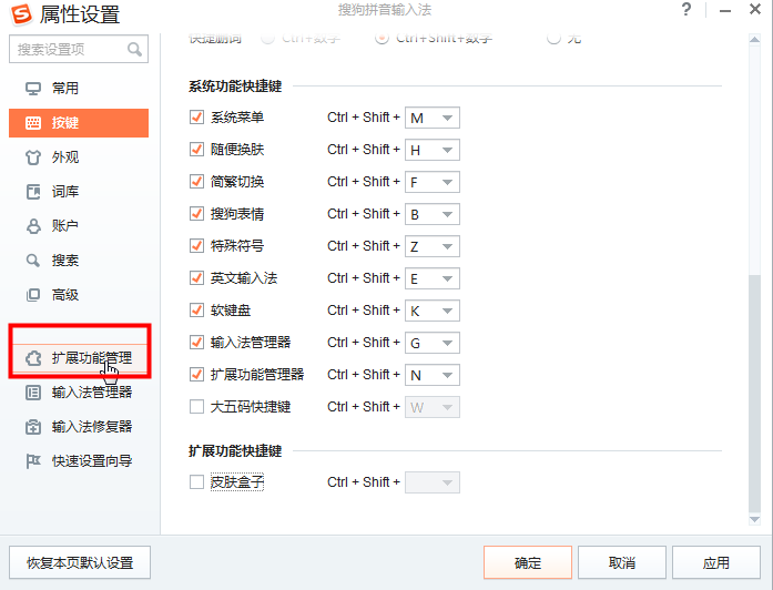 2、在“搜狗输入法设置”界面找到“扩展功能管理”;