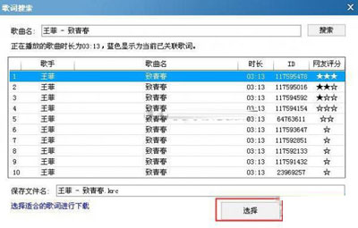 或者在“歌词写真”界面右击鼠标,在弹出菜单中选择“搜索歌词”,点击搜索,选择需下载的歌词,再点击“选择”按钮。就会将选中的歌词替换原来的歌词,并下载到设置的歌词下载路径里。如(图2、图3)