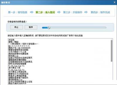 在酷狗音乐中制作歌词,操作步骤很简单,只要进入了制作歌词的界面,其他的就是考验你的记忆的时候了,把歌词填写好,以防万一,可以试听歌曲,修正歌词,最后,按照提示,上传你制作的歌词。