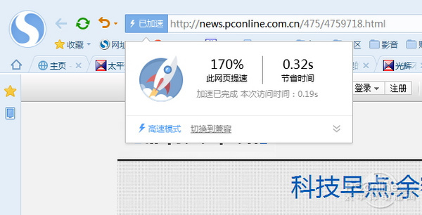 搜狗5.0预取引擎技术生效的样子,地址栏显示“已加速”