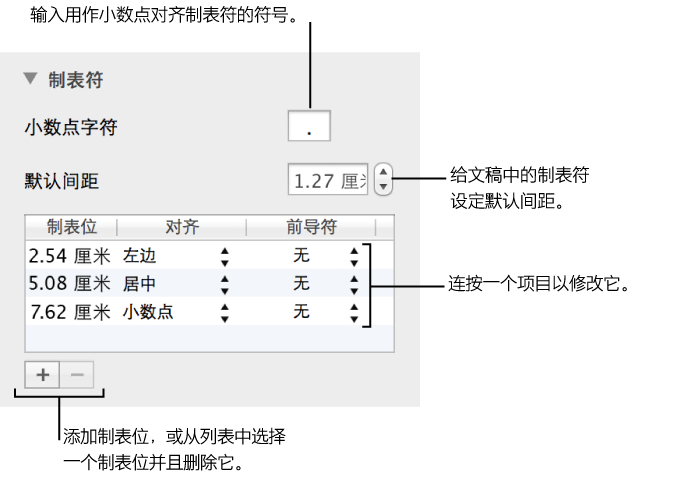 3、若要更改制表位对齐,请按住 Control 键点按制表符图标,然后选取想要的对齐方式(左制表符、居中制表符、右制表符或小数点制表符)。
