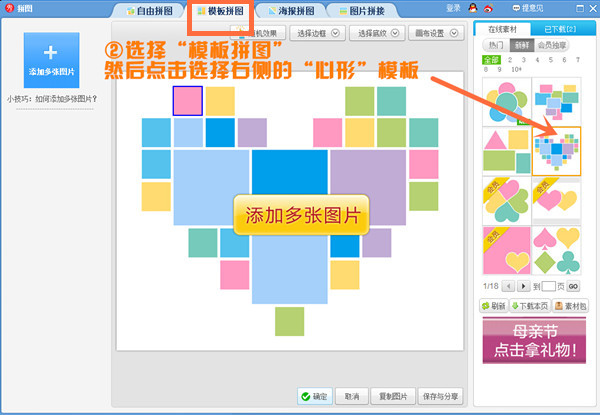 第二步:进入拼图栏目后,选择“模板拼图”,然后点击选择右侧的“心形”模板。