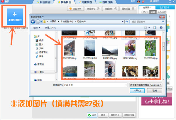 第三步:这个时候就需要添加图片了,这个心形模板需要的图片比较多,一共需要27张才可以填满,如果照片不过也没有关系,去网上找些相关的就行。