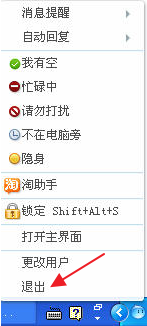 通过右击操作系统右下角的阿里旺旺托盘图标进行退出。右击操作系统的阿里旺旺图标—“退出”,如下图所示。