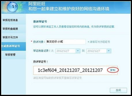 步骤四、在页面上跳出的举证号,点击“复制”即可。