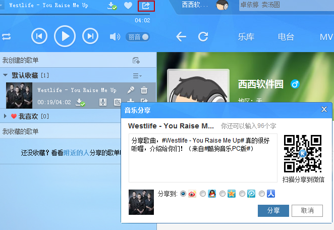 5、上传完毕后选择歌曲,点击上面的分享按钮即可分享到其他平台。