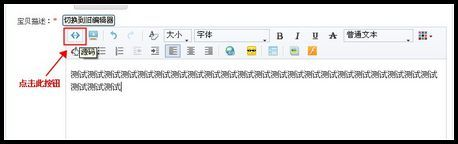 5、第五步:完成选择在线图片状态风格、填写文字提示信息、生成代码、复制代码后进入到出售的中宝贝点编辑,点编辑后将复制的代码输入到宝贝描述中的“源码”文件中,点击宝贝描述设置中的“源码按钮”如下图:
