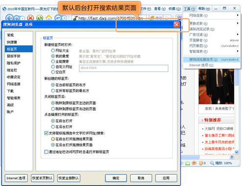 如希望能立刻看到搜索结果,可在搜狗高速浏览器选项中设置“在前台打开拖拽结果页面”;如不希望在拖拽时自动搜索,也可在搜狗高速浏览器选项中关闭这一功能,设置方式如下图所示。