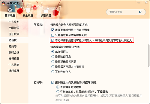 QQ2013请在系统设置=》权限设置=》防骚扰=》取消勾选“不允许将我推荐给可能认识的人,同时也不想我推荐可能认识的人”后重新登录QQ即可。