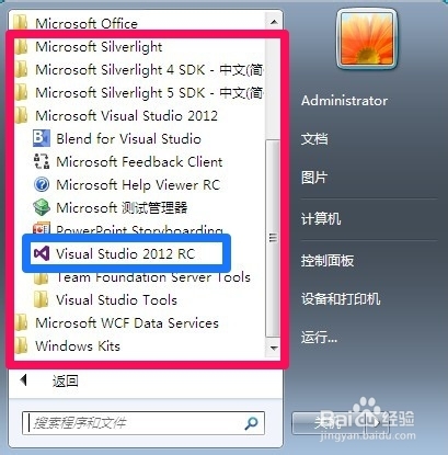 安装成功后,程序自动在开始菜单创建 Visual Studio 2012 的所有程序组: