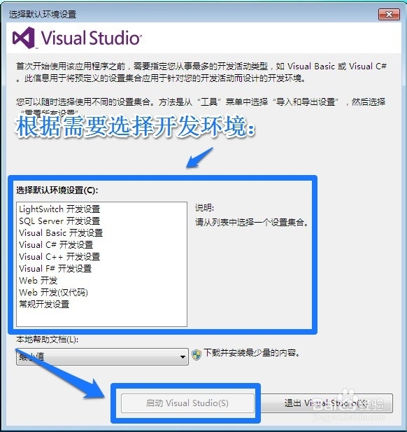 进入默认环境设置,根据自己的需要设置默认环境,如果您使用多钟语言进行开发,则可选择【常规开发设置】,设置完毕后单击【启动 Visual Studio】启动程序!