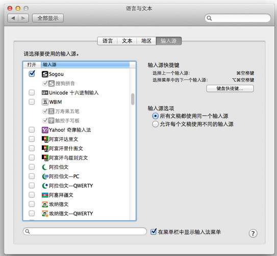 点击桌面左上角苹果图标打开菜单,点击系统偏好设置,在系统偏好设置窗口点击“语言与文本-输入源”,在左侧列表找到Sogou-搜狗拼音,打钩选中(可以在底部输入框输入sogou快速查找),同时选中“在菜单栏中显示输入法菜单”,可以设置“键盘快捷键”为cmd+space选择上一个输入源
