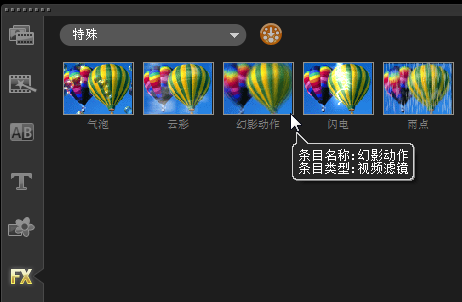 四、打开“特殊”素材库,选择“幻影动作”滤镜效果。