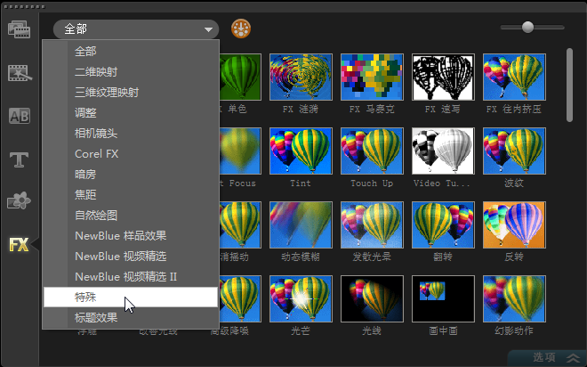三、单击窗口上方的“画廊”按钮,弹出下拉列表,选择“特殊”选项。