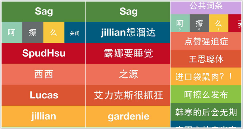 这个产品创新的另一个在于它引入了一个叫“公共词条”的元素,它看起来像是一个词条版的微博,对于每个新闻热词用户都能能干“呵、么、擦”的方式表态,相当于一个很简单的投票机制。目前公共词条还是由团队人工编辑,但在下一版本中将尝试通过 UGC 方式提交,具体交互方式还未定—这将决定用户玩不玩的起来。
