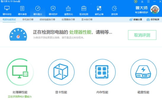 2.点击"开始测评"按钮,系统将对计算机各项硬件配置进行全面性能评估,该测试过程耗时较长,建议耐心等待。