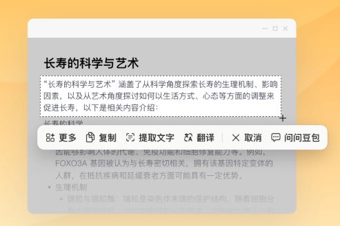 1.用户打开豆包应用后,其核心功能默认可直接调用。具体而言,用户可在应用外部通过划词操作触发多种AI辅助功能,包括但不限于智能搜索、多语种翻译、内容摘要以及专业术语解释等,极大提升使用效率。