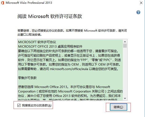 1. 在本站下载新版的Microsoft Visio 2013,双击运行,点击接受条款,之后点击继续。