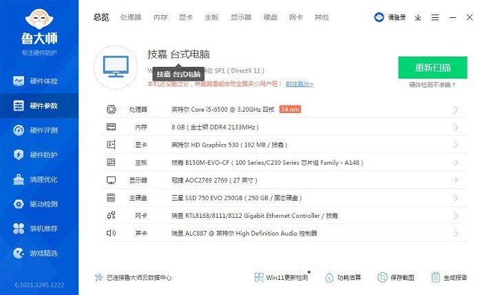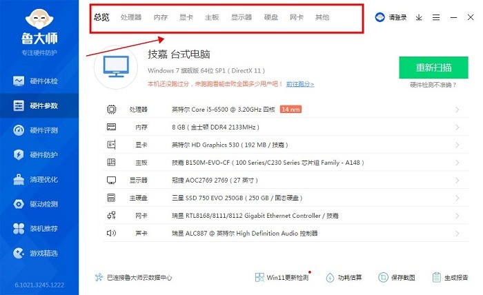 2、检测完成后即可得到总览的电脑参数配置