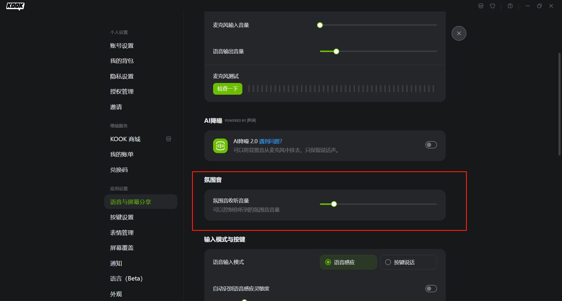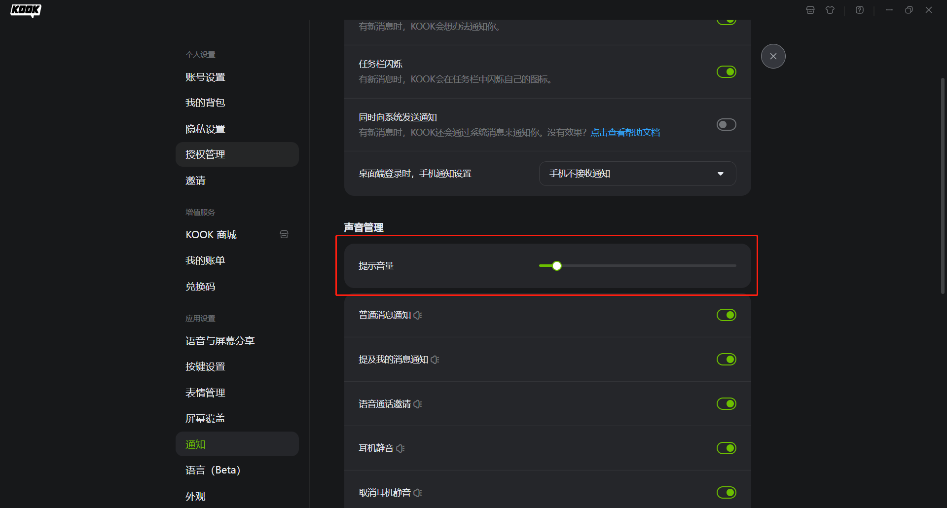 首先确保提示音及氛围音的接收音量是开启的,位置如下图所示
