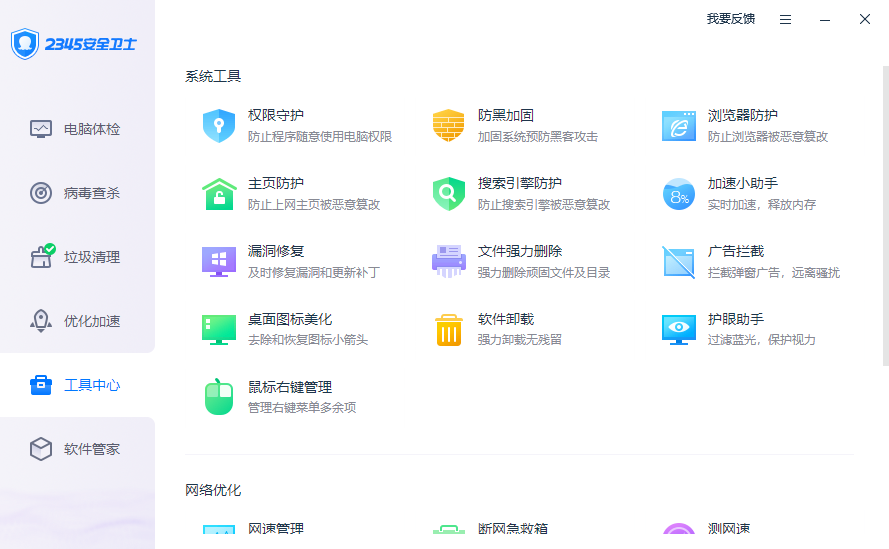2345安全卫士是非常好用的电脑安全软件,2345安全卫士提供了木马查杀、垃圾清理、优化加速等众多功能,安装包也比较小巧,喜欢的朋友可以用用看。