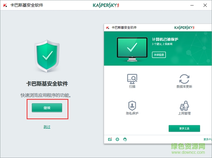 步骤 11. 点击继续查看卡巴斯基安全软件2018的功能。这个步骤是可选的,如果您愿意的话可以跳过它。安装并启动卡巴斯基安全软件2018之后,请使用商业授权激活它。